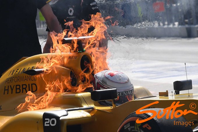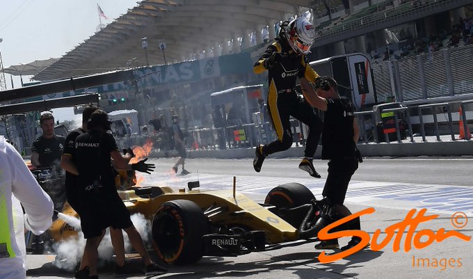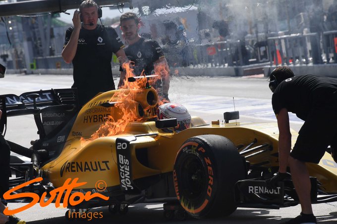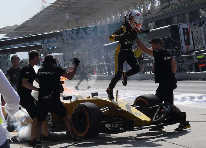 #f1 #Fire @KevinMagnussen @RenaultSportF1 on fire in the pitlane & #Jumpman Jumps out of the car in a hurry @sepangcircuit #MalaysianGP