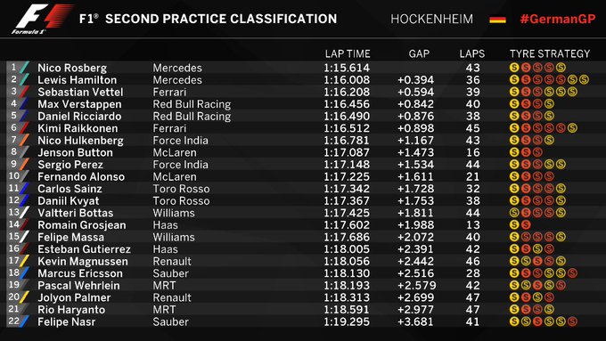 Formula 1@F1·FollowPROVISIONAL CLASSIFICATION (END OF FP2) ROS, VET and HUL give home fans plenty to cheer about #GermanGP 🇩🇪 1:41 PM · Jul 29, 2016695ReplyCopy linkRead 8 replies