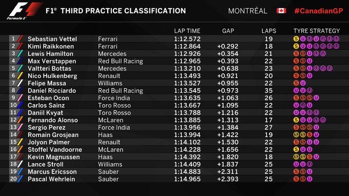 Formula 1@F1·FollowPROVISIONAL CLASSIFICATION (END OF FP3) Vettel shows his mettle 💪 Only a tenth of a second between P2 and P4 ⏱️ #CanadianGP 🇨🇦 #FP3 3:05 PM · Jun 10, 2017666ReplyCopy linkRead 28 replies