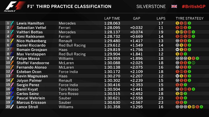 Formula 1@F1·FollowPROVISIONAL CLASSIFICATION (END OF FP3): 👀 Tight between the top three #BritishGP 🇬🇧 #F1 10:05 AM · Jul 15, 2017513ReplyCopy linkRead 9 replies