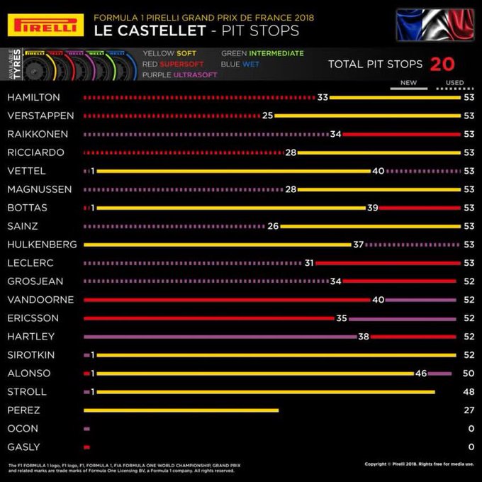 De Grand Prix van Frankrijk zorgde voor het nodige spektakel en ook in de race strategieën waren veel verschillende keuzes te zien. Aan de start bleek al dat veel teams kozen voor andere strategieën en ook tijdens de race werd er gekozen tussen verschillende banden. De keuzes aan de top waren eentonig, maar zeker in het middenveld waren er enkele interessante keuzes te zien.