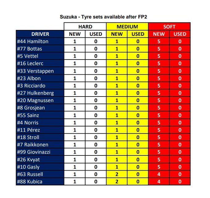 Terwijl bij wisselende weersomstandigheden – de teams beschikken over een beperkt aantal intermediates en regenbanden – er tot voorkort gekozen werd om juist niet te rijden tijdens VT’s, met het doel om de banden te sparen, waarna de FIA besloot door teams tegemoet te komen met extra sets - bevinden zij zich dit keer min of meer in een luxepositie qua droog rubber. Kortom: iets meer pushen tijdens de kwalificatie en race zal gemakkelijker gaan.
