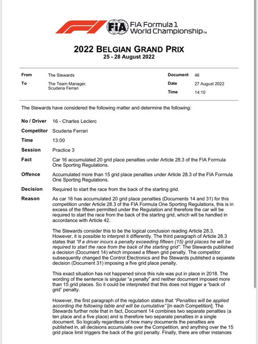 FIA bevestigt namelijk dat er om 13:00 op 27 augustus (de zaterdag van de GP van België) nog eens een paar flinke wijzigingen aan de F1-75 van Leclerc zijn doorgevoerd, waarop een gridstraf staat van twintig plaatsen. Op de vrijdag verdeelde