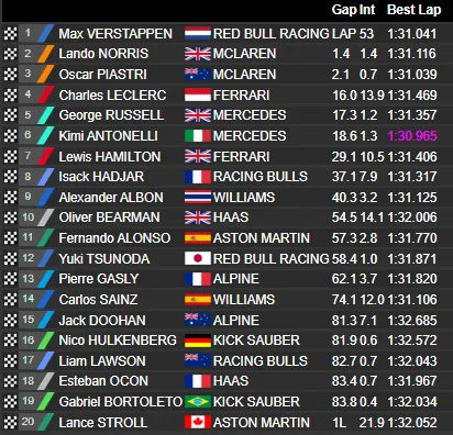 Lewis Hamilton eindigde als zevende voor Isack Hadjar en Alex Albon en Oliver Bearman maakten de top tien compleet. Yuki Tsunoda kon vanaf een vijftiende startplaats weinig betekenen en reed een kleurloze race in zijn thuisland.