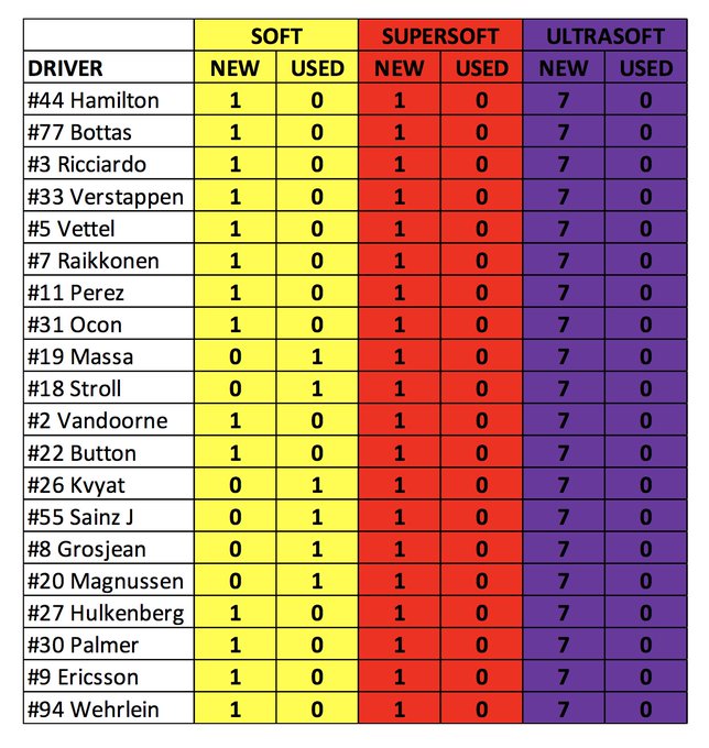 Pirelli Motorsport@pirellisport·FollowWant to know which #F1 drivers have which tyres left after #FP2 yesterday? Your wish is our command:10:01 AM · May 26, 201759ReplyCopy linkRead 2 replies